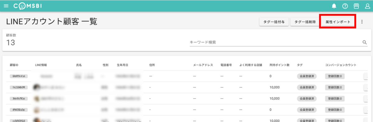 • COMSBIの顧客情報にいない顧客のデータはインポートされません。お友だち登録かつCOMSBIに顧客情報が取り込まれているユーザーのみ反映されます。