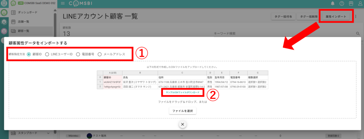 顧客一覧画面から、顧客情報が記載されたCSVファイルをアップロードすることによって、顧客属性情報をインポートすることができます。
