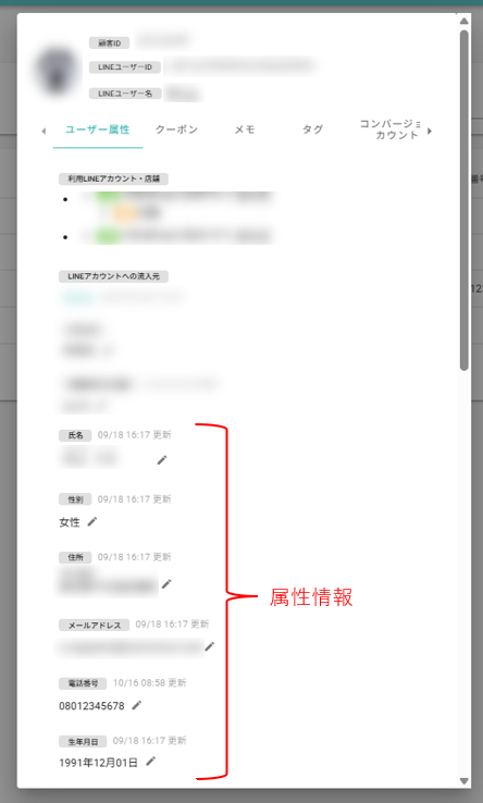 顧客情報の詳細画面に表示されている氏名やメールアドレスなどのプリセット情報や、顧客属性マスターで設定された顧客属性のことです。