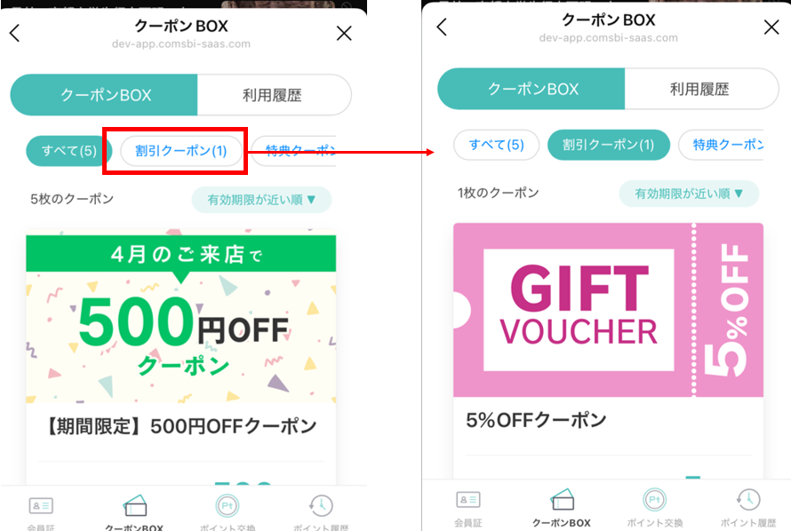- 例:ユーザーAが期間限定、割引というグループのクーポンを所有している場合は「期間限定」「割引」が表示されるが、ユーザーBが割引グループのクーポンしか所有していない場合は「割引」のみ表示される