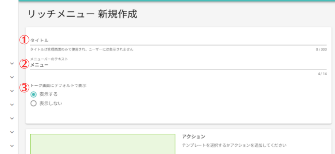 カスタムリッチメニューを作成する場合でも、必ずアクションに「プリセットメニューリンク」のいずれかの項目を設定してください。