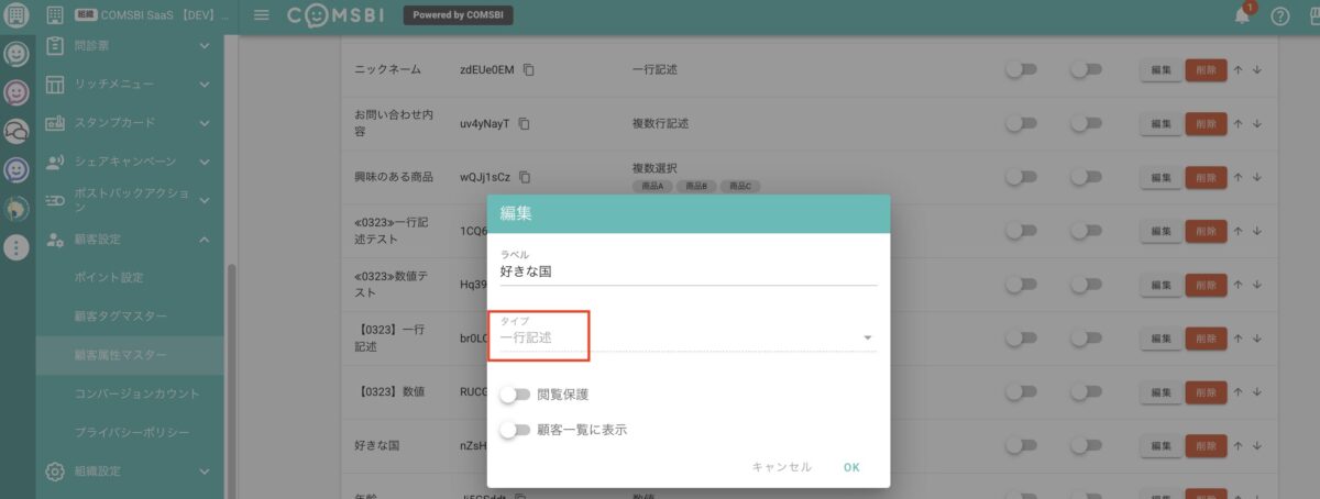 ① COMSBI管理画面の「顧客属性マスター」から、「一行記述」または「数値」タイプで