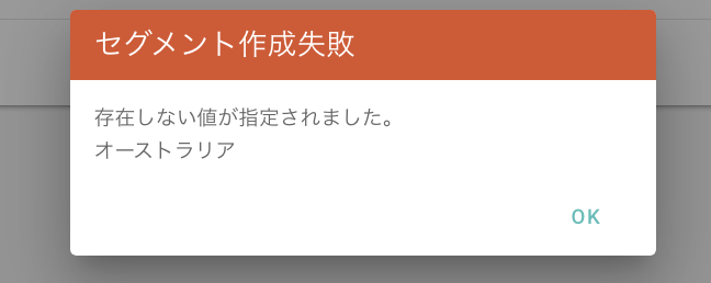 「セグメント作成失敗」の表示が出ます。この場合は、存在しない値を除いたCSVを再度アップロードしてセグメント作成をしてください。