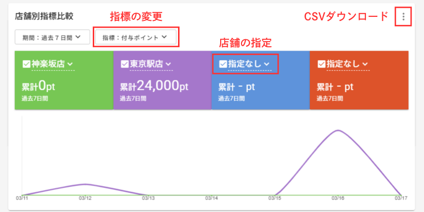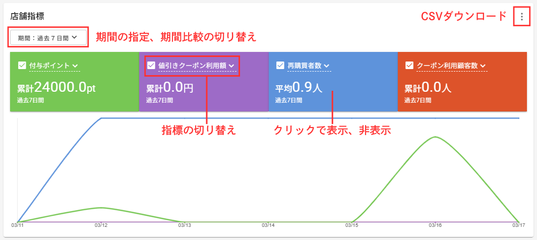 店舗の指定した指標のデータがグラフで表示されます。表示期間を指定したり、前の期間との比較をすることもできます。