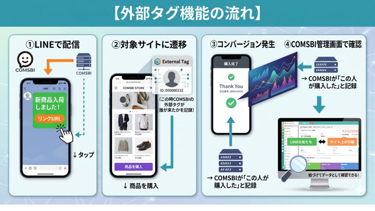 たとえばLINEのリッチメニューからお客様のサイトに遷移したとします。外部タグ機能を使うと、その後サイト上で「商品を購入した」「お問い合わせした」といったコンバージョン(成果)を、COMSBIの顧客データと紐づけて把握できるようになります。つまり「LINE登録 → サイトに来た → 購入した」という一連の流れを見える化できます。