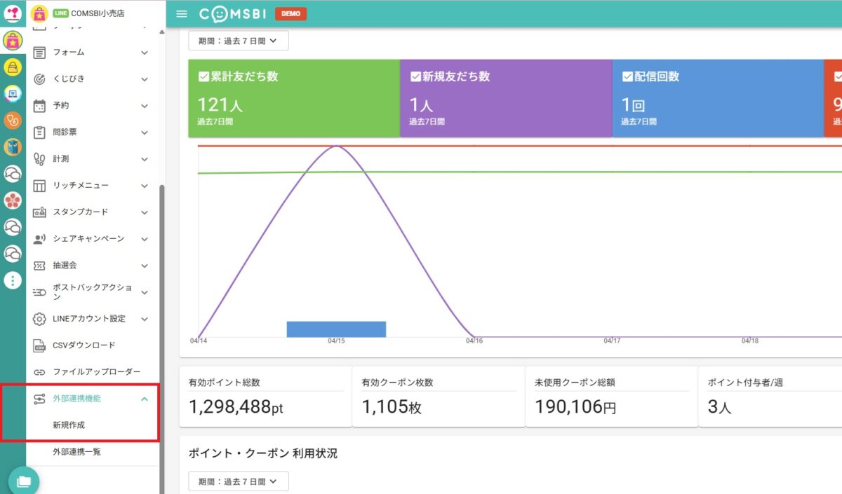 1.アカウントをクリック後、外部連携機能から「新規作成」を選んでクリックしてください。