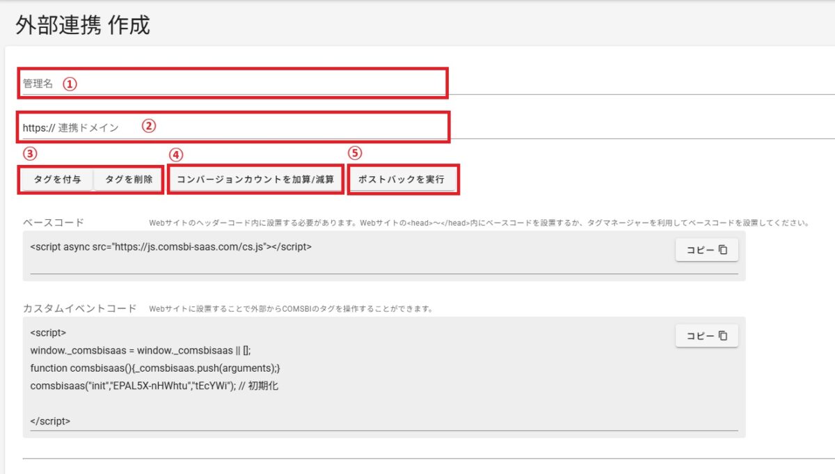 タグを付与/削除やコンバージョンカウントの減産加算のみであれば、外部連携設定画面のみでの操作も可能です。