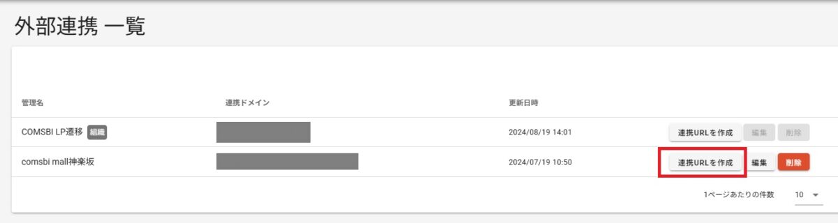 1.作成した外部連携の設定の一覧から「連携URLを作成」をクリックします。