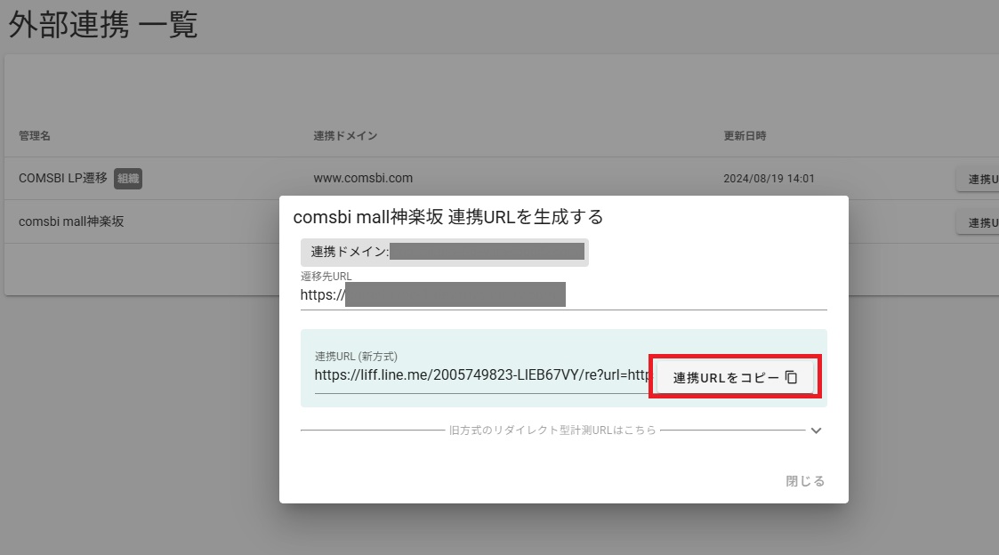 2.「連携URLをコピー」からURLをコピーして遷移先として指定するか、遷移先として指定したいURLを、URL遷移の形式で計測化してください。計測URLの発行方法はこちらをご確認ください。