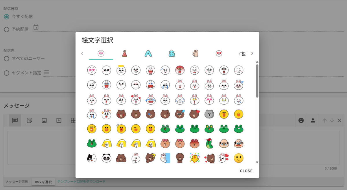 メッセージ作成画面でLINE絵文字が使えるようになりました。より表現豊かなメッセージを作成いただけます。