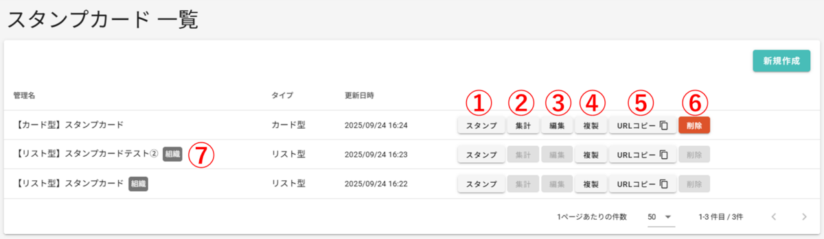 組織操作画面で作成したスタンプカードは「組織」タグが付きます。編集や削除は組織捜査画面から行ってください。