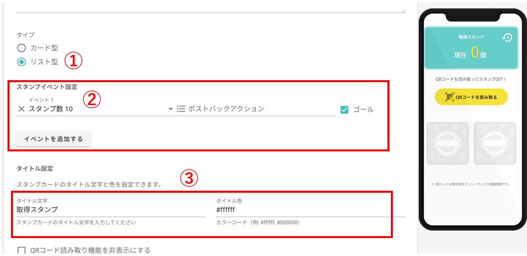 スタンプはお客さまが「QRコードを読み取る」から立ち上げたカメラでQRコードを読み込んで付与される仕組みになっています。こちらではスタンプ付与のためのQRコードの設定ができます。