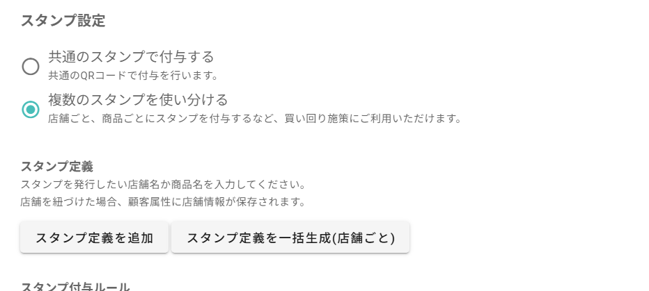 スタンプ定義・・・QRコードを発行したい店舗名か商品名を入力できます。店舗ごと、商品ごとにスタンプを付与するなど、買い回り施策にご利用いただけます。