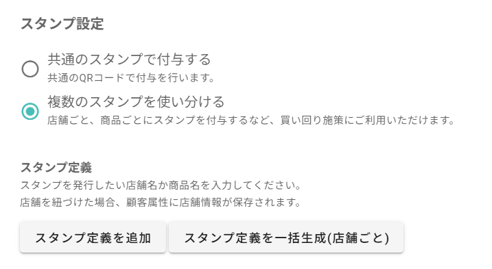 もしくは「スタンプ定義を一括生成(店舗ごと)」でアカウントに設定されている店舗分の作成が可能です。